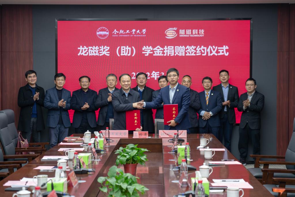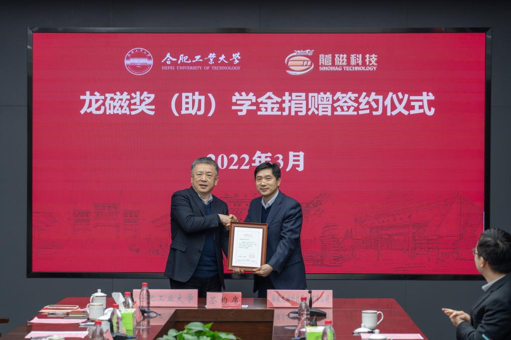 余其俊介绍了学校发展历程以及近年来在“双一流”建设、人才培养、师资队伍建设、科技创新等方面取得的成就。余其俊指出,近年来,学校坚持面向国家战略需求和国际学术前沿,大力加强需求引导型基础研究,聚焦前沿技术和颠覆性技术创新,推进有组织科研和交叉学科研究,在国家自然科学基金创新研究群体项目、国家重点研发计划项目、重大仪器专项等项目上不断取得突破,多项成果在国家重点工程和国防工程中得到应用。学校科技成果转移转化规模位居全国高校前列,以“企业出题、政府立题、高校解题、市场阅卷”为特色的政产学研用“合工大模式”得到了地方和行业龙头企业的高度认可。余其俊表示,学校的学科布局、科研优势与安徽龙磁的发展需求高度契合,双方合作前景广阔,期待双方在本次设立奖助学金的基础上,进一步加强其他领域交流合作,不断开启校企战略合作新篇章。