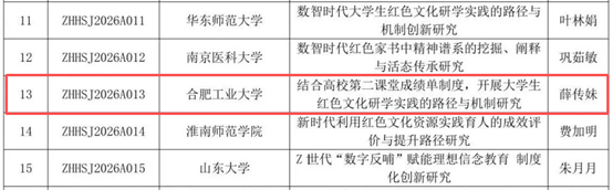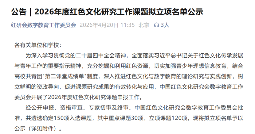 近日,中国红色文化研究会数字教育工作委员会2026年度红色文化研究课题立项结果公布,我院辅导员队伍课题《结合高校第二课堂成绩单制度,开展大学生红色文化研学实践的路径与机制研究》获重点课题立项支持。