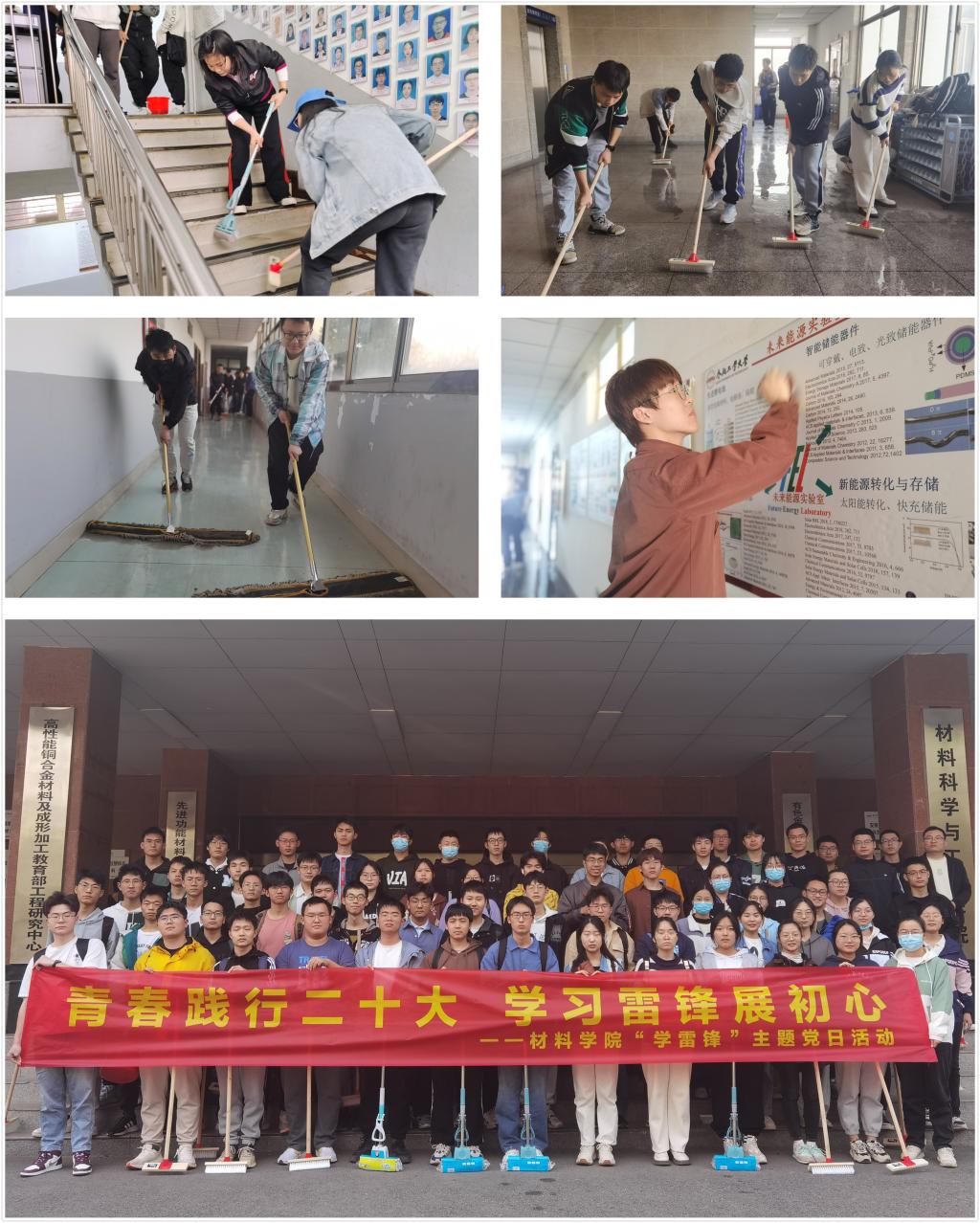 在材料楼组织开展了“青春践行二十大,学习雷锋展初心”学雷锋主题党日活动,集中清理材料楼公共区域卫生。学院相关负责人、全体本科生、研究生党支部学生党员、党校69期各学员班学员代表共200余人参与本次活动。