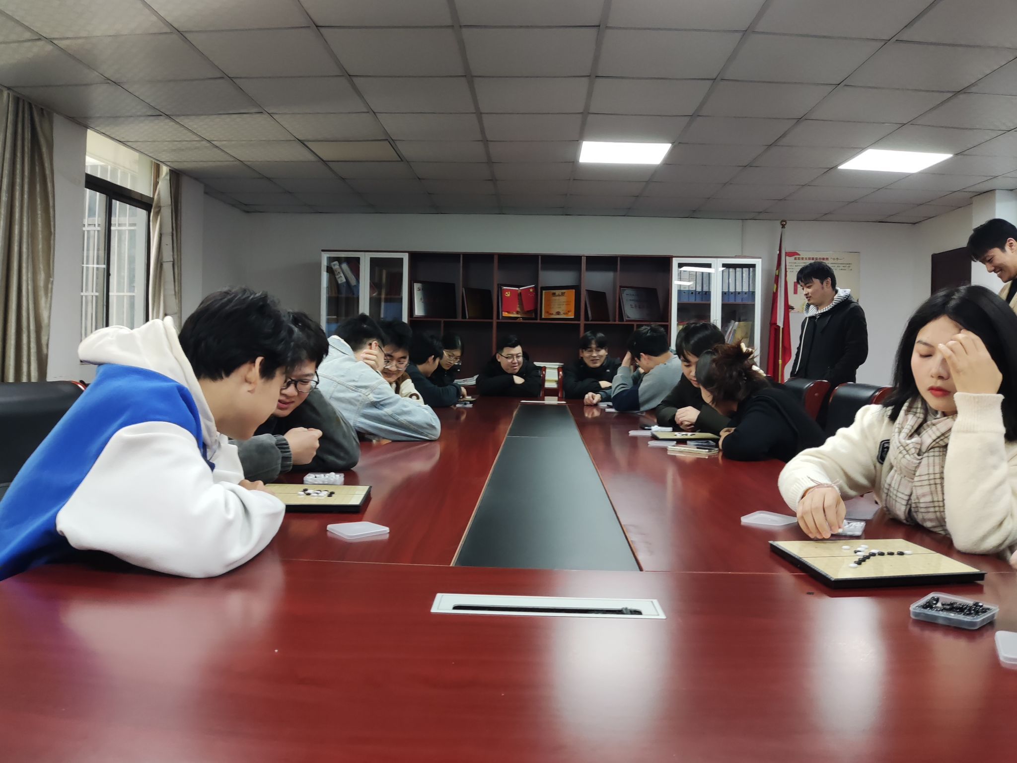 比赛共有来自不同专业的20名学生参与,他们经过层层选拔获得了参赛资格。参赛同学随机抽签分组,各组采取三局两胜制,胜方可进行下一轮比赛,负方淘汰出局。开始比赛时猜先,本次活动采用无禁手规则:双方依次落子,先在棋盘上形成横向、竖向、斜向的连续相同颜色的五个棋子的一方为胜。