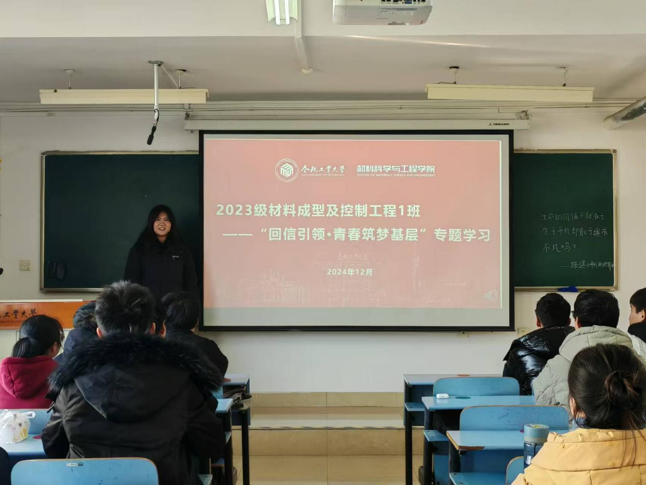组织材料成型及控制工程2023级1班团支部开展了主题为“回信领航·青春筑梦基层”的特色团支部活动。支部青年全部参与了本次团日活动。
