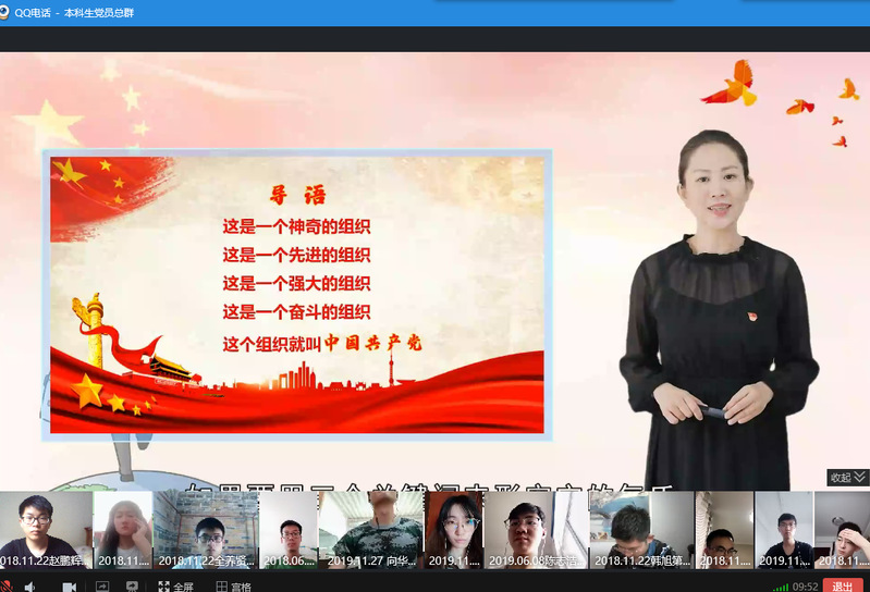 在本科生党员总群通过QQ群“云”平台开展了题为“在战‘疫’中读懂中国共产党”的线上视频微党课主题学习教育活动,院党委副书记、副院长杨玲老师担任主讲老师,50余名学生党员在线参加。