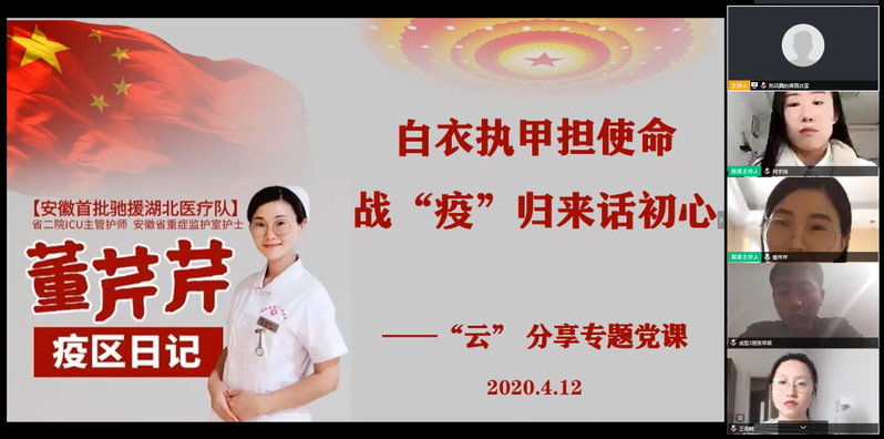 以共抗疫情、爱国力行为主题,组织了一场特别的党校开班仪式,邀请了安徽省首批援鄂医疗队队员、安徽省向上向善好青年、安徽省江淮护理之星、合肥市三八红旗手、省首批援鄂医疗队队员、安徽省第二人民医院重症医学科主管护师、董芹芹担任主讲老师,以“白衣执甲担使命,战‘疫’归来话初心” 为题,给学生们进行了一场生动的党性和思政教育大课。学院相关负责人、辅导员和第63期积极分子班全体学员和部分学生党团骨干、学生代表等共计120余人隔空集合,共同聆听交流。