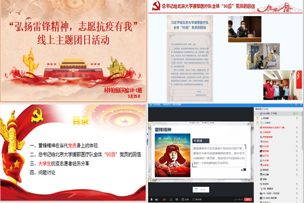 53个团支部依托QQ群、腾讯会议等线上方式,开展了“弘扬雷锋精神,志愿抗疫有我”“学习雷锋精神,致敬抗疫者”“弘扬雷锋精神,时代楷模在我身边”等主题团日活动。通过重温雷锋故事,重读《雷锋日记》,重看《雷锋》电影,重唱《学习雷锋好榜样》,线上参观“雷锋纪念馆”等环节,学习永恒的雷锋精神。通过分享“武汉,我的战役日记”“致敬逆行者”,触摸“抗疫群英谱”,感悟疫情时期的雷锋精神。通过再读总书记给北京大学援鄂医疗队全体“90后”党员的回信,传承新青年的时代雷锋精神。线上主题团日活动开展过程中,各团支部青年学生积极分享自己眼中的“活雷锋”,纷纷表示要从我做起,尤其是在疫情防控时期,用实际行动向雷锋同志致敬,争做新时代雷锋精神的传承者与践行者。