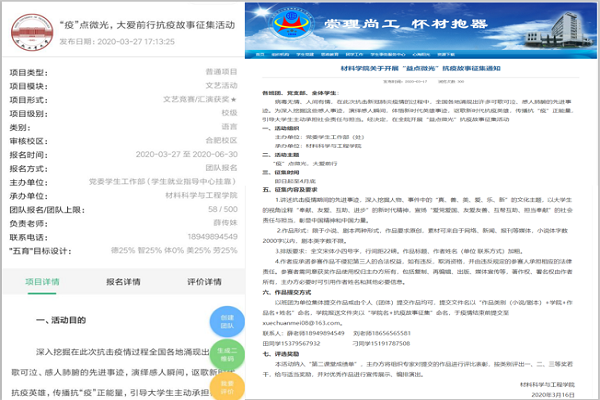 依托第二课堂平台,在全院学生中深入开展“益点微光,大爱前行”抗疫微故事征集活动,鼓励学生在疫情期间讲述抗击疫情的先进事迹,深入挖掘人物、事件中的“真、善、美、爱、乐、新”的文化主题,以大学生的视角诠释“奉献、友爱、互助、进步”的新时代精神,宣扬“爱党爱国、友爱友善、互帮互助、担当奉献”的社会责任与担当,讲述新时代雷锋故事,体悟新时代英雄事迹,讴歌新时代抗疫英雄,传播抗“疫”正能量,活动开展过程中已有近200名同学报名参加。