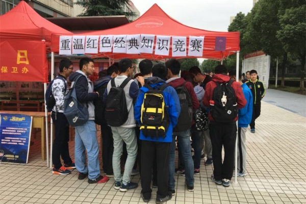 于一食堂广场开展了以“宣扬红色经典”为主题的近代史知识竞答活动,吸引众多同学参与。