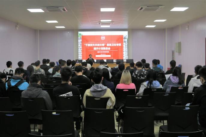 在综合楼多功能报告厅举行了“千寝百天 共创文明””寝室卫生专项提升计划推进会,学院各寝室代表参加会议。