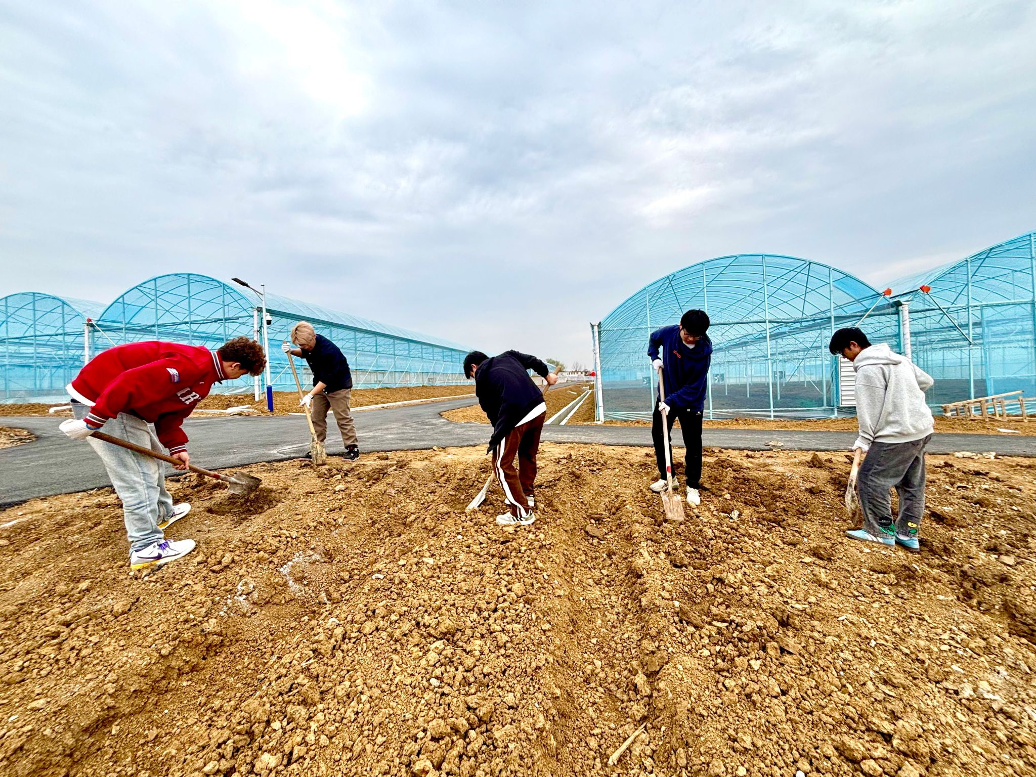 当地经验丰富的师傅从起垄挖坑到播种树苗,从播种深度到浇水频率,为同学们介绍了迷迭香的植物特点和种植方法,并进行实地示范。同学们带上手套,拿起铁锹等工具,走到各自负责的区域,开展劳动实践。劳动过程中,师傅穿梭在迷迭香的种植区域,检查同学们的种植情况,仔细教导同学们辨别种歪的植株,查看是否存在漏种的苗坑、埋土不够严实的植株。在师傅的指导下,同学们认真地弯腰查看,小心翼翼地扶正种歪的苗,将迷迭香种植工作做细做好。经过一上午的劳动,同学们共完成3000株迷迭香的种植。