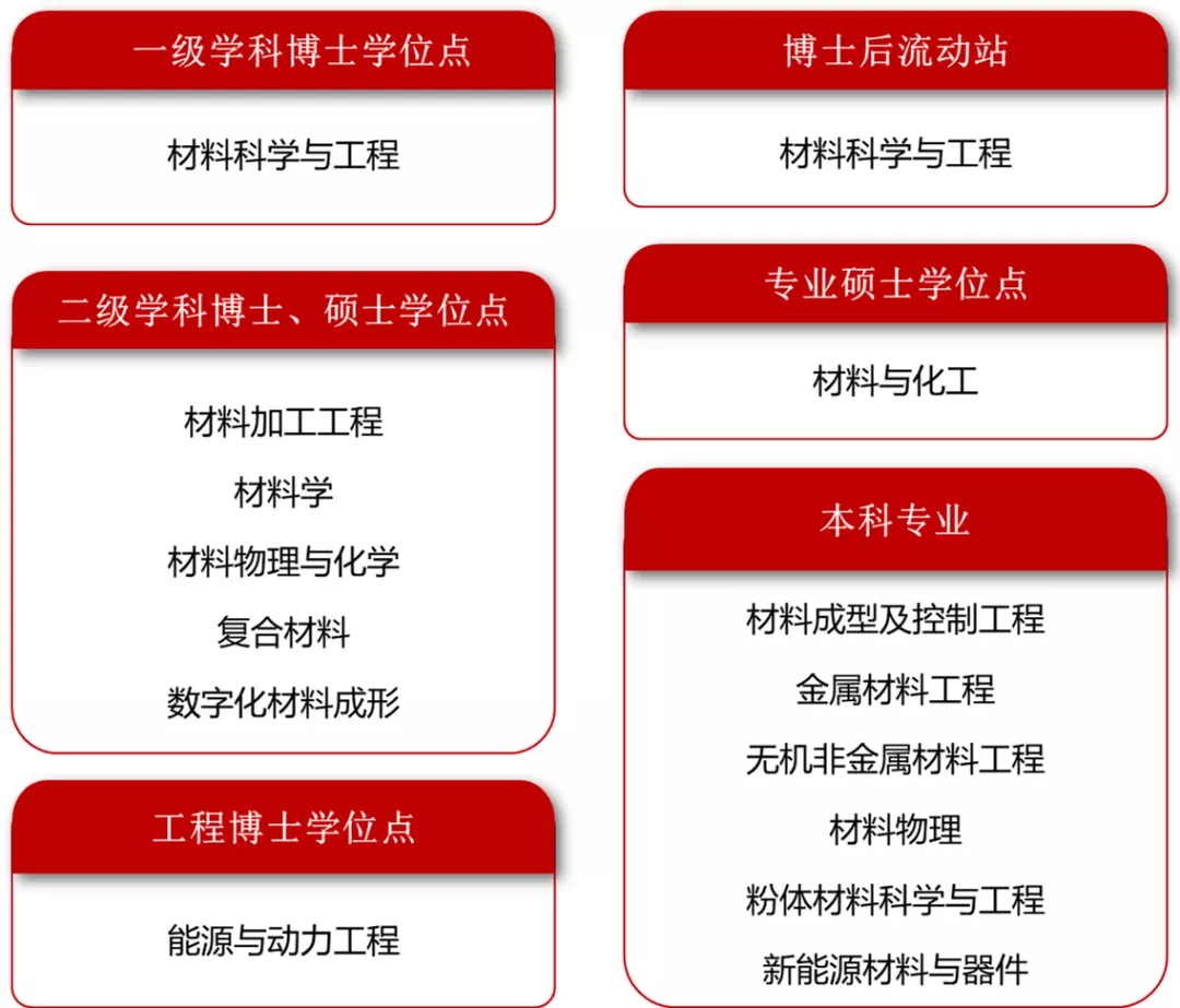 学院设有材料科学与工程一级学科博士学位点,一级学科博士后流动站,材料加工工程、材料学、材料物理与化学、复合材料、数字化材料成形5个二级学科博士学位(硕士学位)点,设有能源与动力工程博士学位点、材料与化工专业硕士学位点和6个本科专业。形成了“本科—硕士—博士—博士后”完整的高层次人才培养体系。